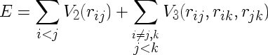 The angle theta_jik is the bond angle between the bonds ij and ik. V2 and V3 are zero for rij larger or equal to a1ij and a2ij, respectively. The following IMD parameters correspond to the potential parameters: